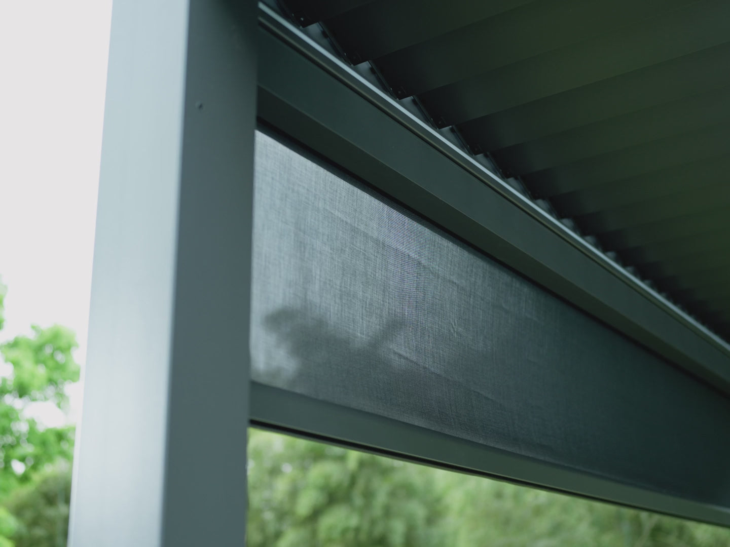 A motorized adjustable louvered roof features slats that can be opened or closed with the push of a button, allowing precise control over sunlight, shade, and rain protection for all-weather comfort.